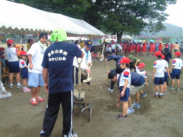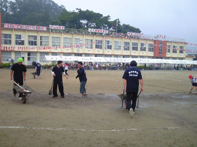お昼休みも降り続いた雨で、昼過ぎからの競技に影響が出そうと言うことで、どこからともなく集まってきたおやじの会のメンバーと他お父様方で校庭の水溜まりに砂を撒くという作業が始まりました。