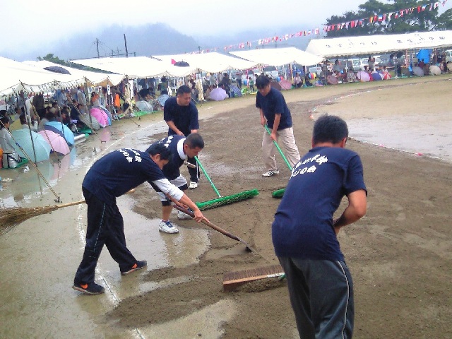 おやじの会とお父様方、そして先生方の尽力もあり、なんとか午後の競技が再開できそうなコンディションまで回復しました。