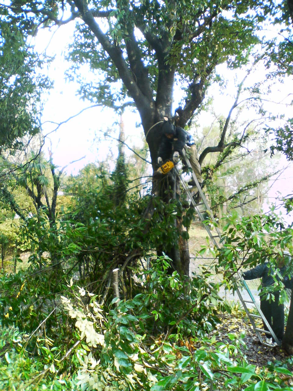| なんと、安全帯をした「松下会員」が樹上にいらっしゃるじゃないですか! ご自慢のチェーンソー技が炸裂!! Myログハウス作成で培ったチェーンソー裁きが見事です。 もうそりゃ、ウィーンウィーン斬る斬る。 |