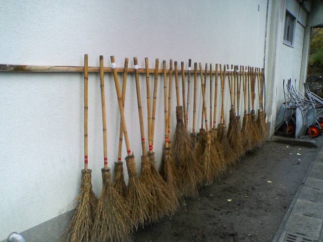 | ご覧の通り、見事な”竹ぼうき”掛けが完成! ほうきの柄の頭が揃っているのに注目です。 生徒の皆さん! 大事に使ってください。 |